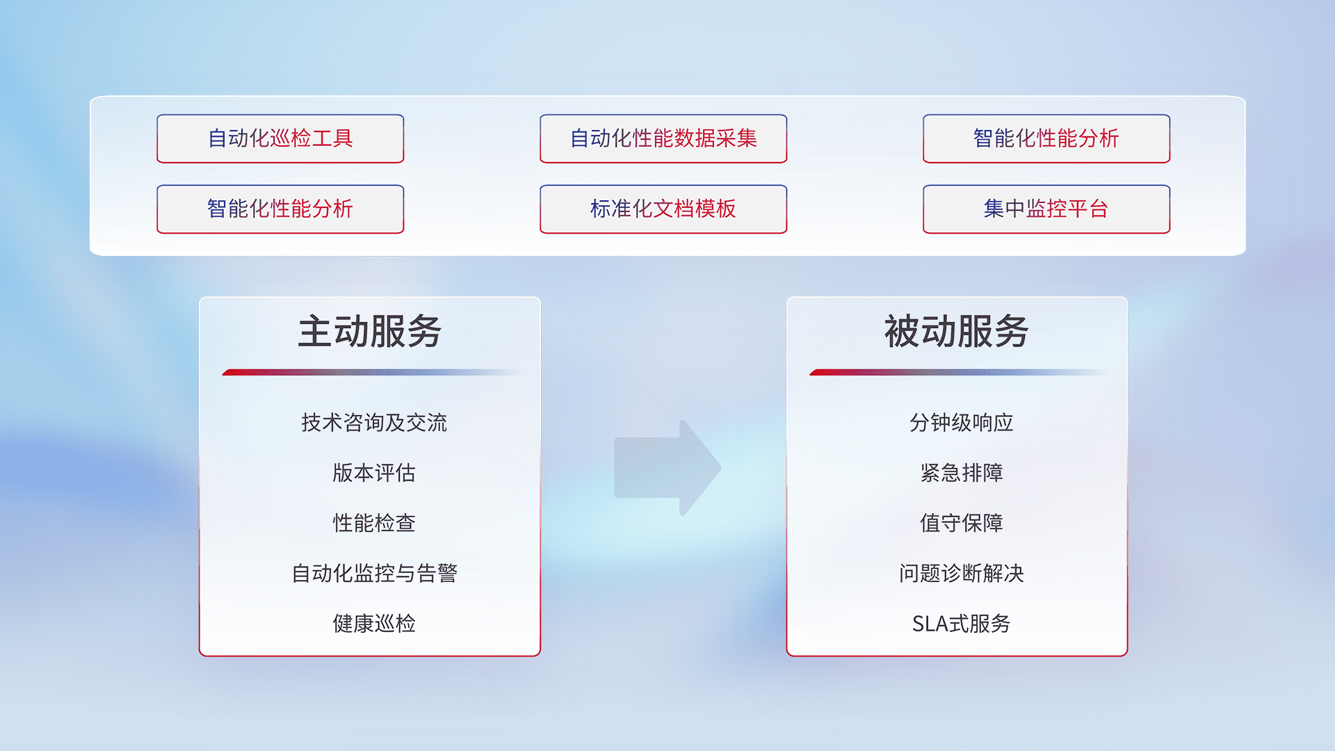 智能化工具和标准化文档,,,保障服务质量,,提供主动服务(包含技术咨询、、、版本评估、、、、性能检查、、、、自动化监控与告警、、、健康巡检)和被动服务包含(分钟级响应、、紧急排障、、值守保障、、、、问题诊断解决、、、SLA服务)。。。。